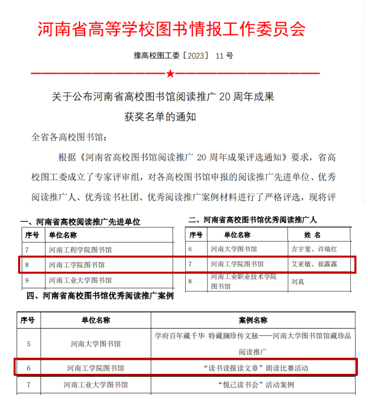 近日,河南省高校图书馆阅读推广20周年成果评选表彰大会在郑州召开,我校图书馆获“阅读推广先进单位”、艾亚敏和崔露露两位老师获优秀阅读推广人、“读书读报读文章”获优秀阅读推广案例。