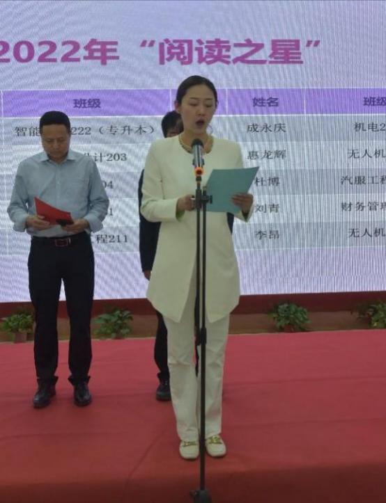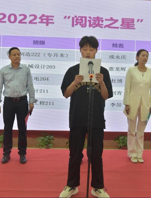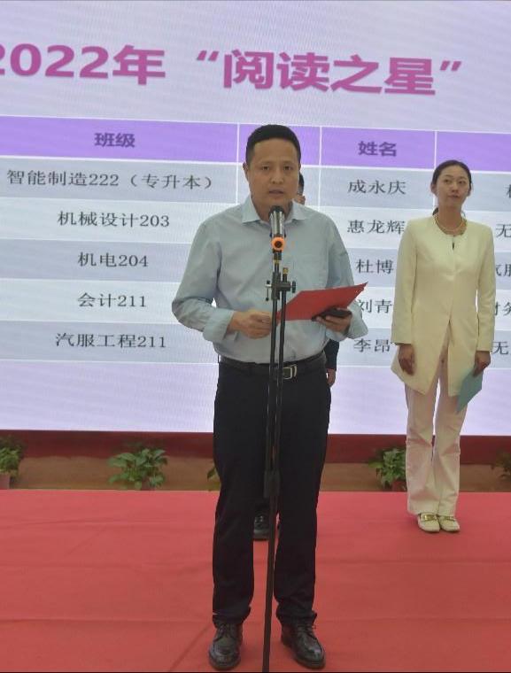 教务处处长郑先锋代表教学、学生管理部门、各院部对读书季活动表示热烈祝贺并致辞。他强调阅读对青年学子的重要意义,勉励同学们要与时俱进、坚持学习、博览群书、奋发有为,为建设社会主义现代化强国努力奋斗。仪式上,校团委书记郭宇宣读了2022年下半年度“阅读之星”获奖名单。与会领导为获奖同学颁发了证书及奖品。学生代表表示要通过读书启迪思想、养成良好的品格,为学校和社会发展做贡献。最后,党委学工部部长李士晓宣布活动正式启动。