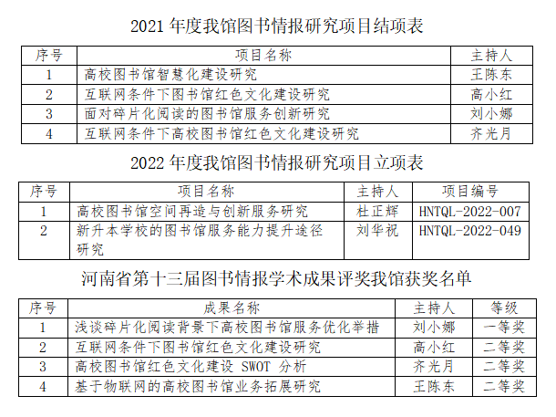 近日,河南省图书馆学会、河南省科学技术情报学会、河南省高等学校图书情报工作委员会联合发文公布了2021年度河南省图书情报研究项目结项名单、2022年度河南省图书情报研究项目立项名单和河南省第十三届图书情报学术成果奖获奖名单,我校图书馆有4个项目获批结项,2个项目获批立项,4项研究成果获奖,其中,一等奖1项,二等奖3项。