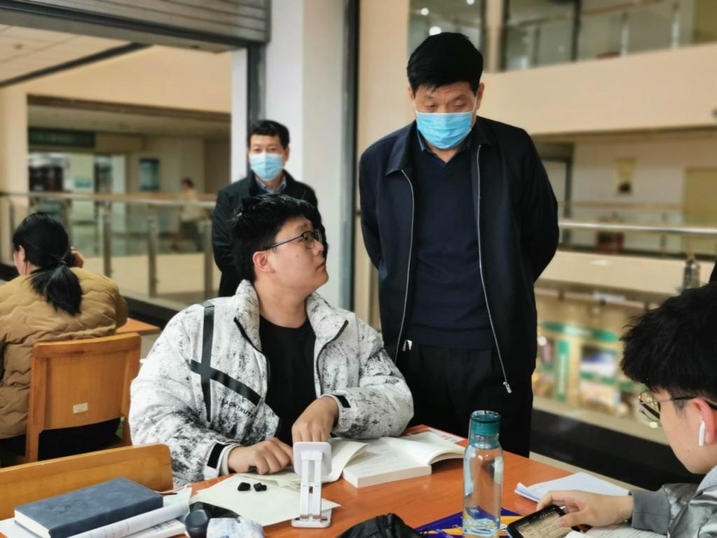 陈校长从一楼步行至七楼逐层进行了实地考察,并与学生进行了亲切交谈,鼓励他们努力学习、积极备考,考研取得好成绩。李吉彪馆长从图书馆的布局结构、馆藏文献资源、智慧图书馆建设、学生阅览情况、图书借阅量、电子文献、服务优化等方面做了详细的汇报。陈校长在听取汇报后对图书馆在资源建设、学生服务等方面的工作给予了充分肯定,对不足之处给予了现场指导。
