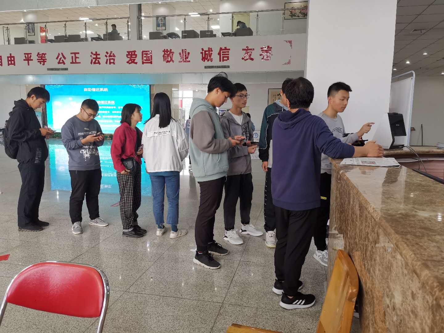图书馆悉心的为同学们提供饮用水和休息座椅,为前来咨询的学生答疑解惑,耐心细致的进行正确引导,并为他们讲解自助借还图书机和自助查询机等设备的使用方法及借阅流程等;帮助新生开通图书借阅证(一卡通)的借阅权限,并录入人脸识别信息。