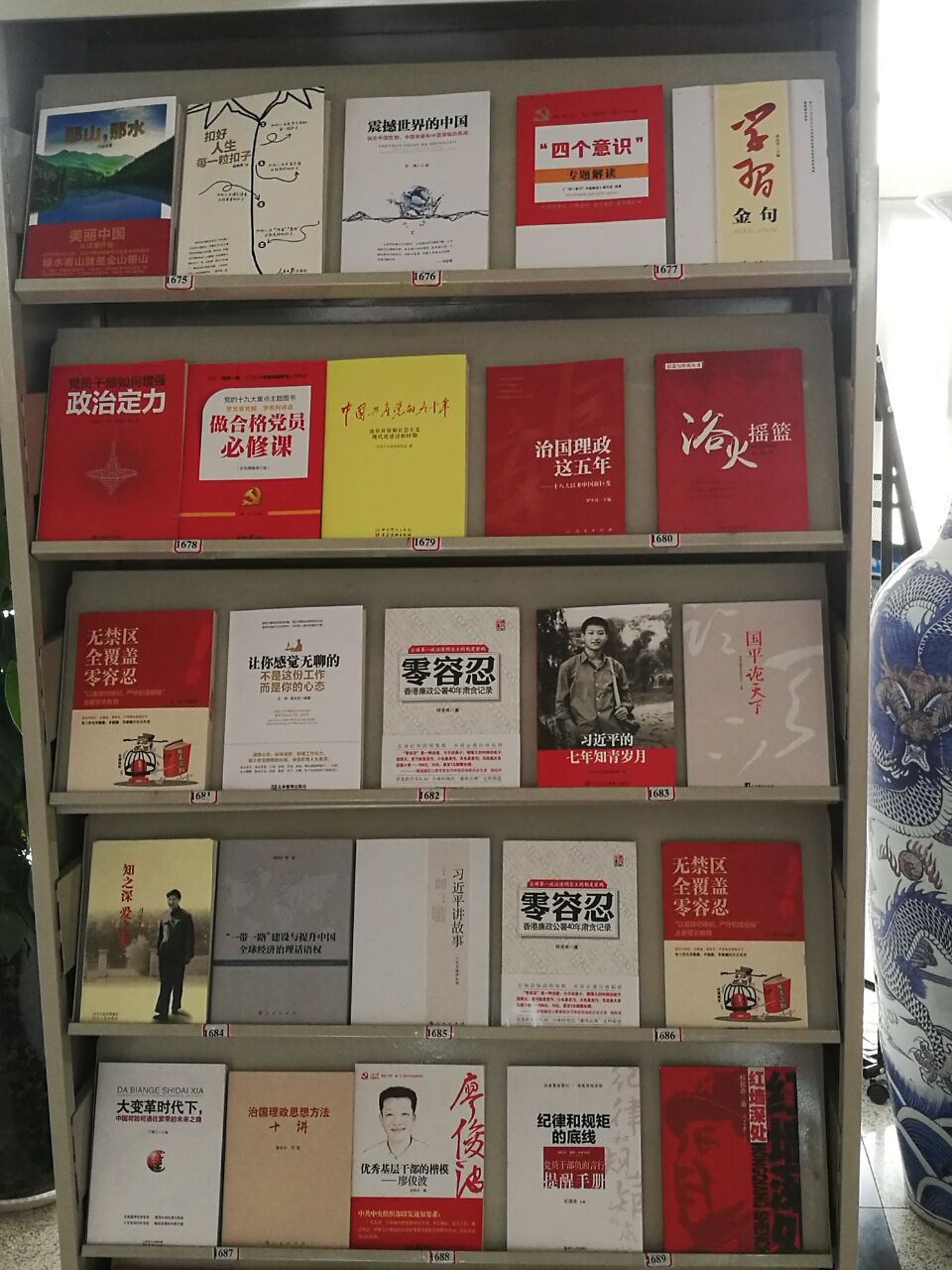 图书展示区域展示了五个系列60余种图书:一是“中国故事”系列,展出了《新发展理念案例选:领航中国》、《中国梦谁的梦》等围绕实现中华民族伟大复兴的中国梦、阐释党中央治国理政新理念、新思想、新战略的图书;二是“一带一路”系列,展出了《一带一路建设与提升中国全球经济治理话语权》、《震撼世界的中国》等围绕“一带一路”建设和“走出去”战略等内容的图书;三是“辉煌历程•党史”系列,展出了《中国共产党的九十年》、《时代大潮和中国共产党(人大)》等围绕中国共产党96年光辉历程、团结带领中国人民取得彪炳史册的历史成就等内容的图书;四是“砥砺奋进•成就”系列,展出了《十八大以来总书记点赞的优秀共产党员》、《优秀基层干部的楷模--廖俊波》等党的十八大以来我国在经济建设、政治建设、文化建设、社会建设、生态文明建设上取得的辉煌成就等内容的图书;五是“迎十九大”主题重点出版物《大变革时代下,中国将如何通往繁荣的未来之路》、《砥砺奋进--以优异成绩迎接党的十九大知识竞赛500题(盛家)》等系列图书。