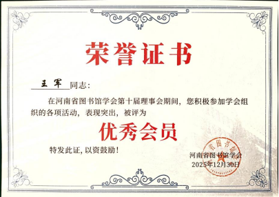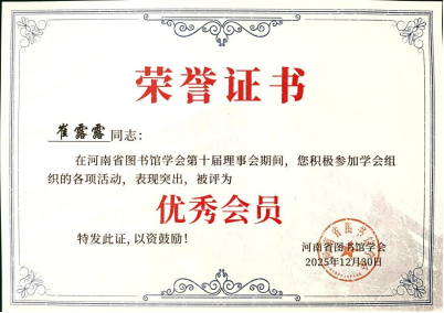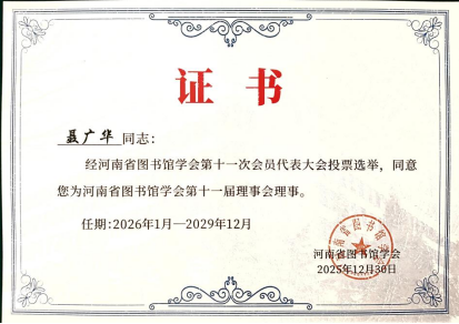 同期,2025年12月29日至30日,河南省图书馆学会第十一次会员代表大会暨十一届一次理事会在郑州隆重召开,会议对128名“优秀会员”进行了表彰、选举产生了第十一届理事会理事,我校聂广华当选第十一届理事会理事,王军、崔露露被评为河南省图书馆学会十届理事会“优秀会员”。