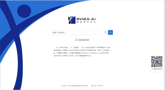 一,如下图是该数据库首页,首页可以直接进行文章检索,也可以打开期刊列表页进行期刊检索,同时还嵌入了worldlib人工智能在线咨询的网页端,点击右下方二维码即可进行检索。