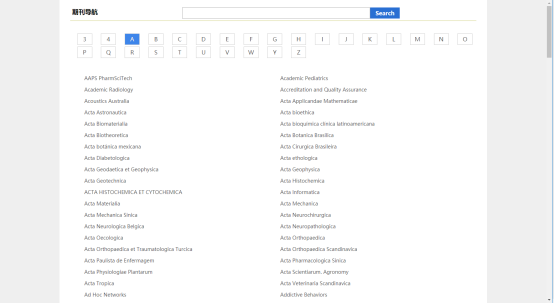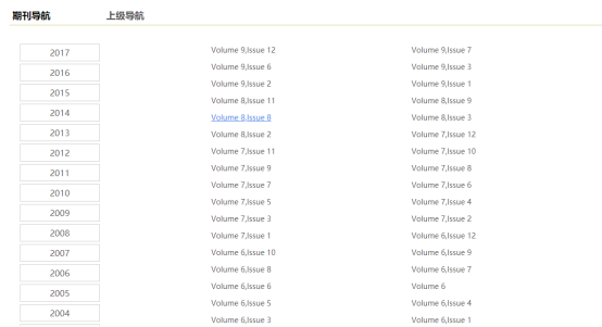 二,期刊导航页,根据首字母排序,可以进行期刊名检索。点击选择期刊可以打开该期刊的期卷列表。