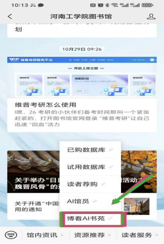 2、登录“河南工学院图书馆”微信公众号,点击“资源推荐”进入“博看AI书苑”