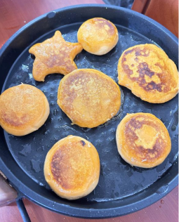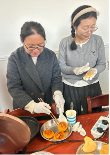 大家将红薯洗净蒸熟拿到会场便开启了创意美食之旅。在揉至面团的过程中,大家相互交流技巧,分享生活中的点滴趣事,欢声笑语回荡在整个活动现场。大家将糯米粉与红薯泥完美融合,再将面团分成小块,搓成圆球按压成饼,并巧妙地包入芝士碎和芝麻等不同馅,大家还发挥创意,制作出海星、小猫、小狗脸等形状各异的作品,为传统的红薯饼增添了独特的风味。当电饼铛里的嗞嗞声,伴随着逐渐弥漫开来的香甜气息,让每个人都充满了期待。当金黄酥脆的红薯饼出锅时,大家纷纷拿起自己的作品拍照留念,共同分享这份劳动成果带来的喜悦。