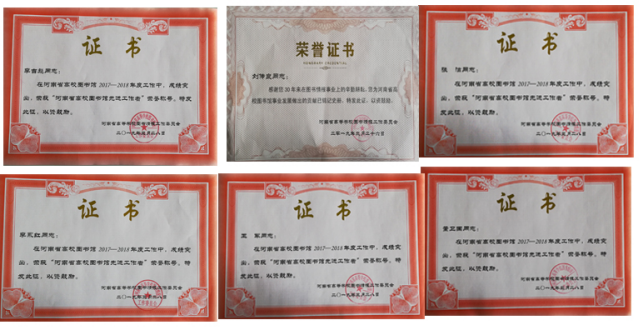 近日,河南省高等学校图书情报委员会下发《关于评选河南省高校图书馆2017~2018年度先进工作者暨对在图书馆连续工作30年的同志颁发证书的通知》(豫高校图工委[2019]1号)、《河南省高校图书馆2019年工作会议通知》(豫高校图工委[2019]02号),经过遴选推荐和专家评审,在河南省高校图书馆2019年工作会议上,为我馆李吉彪、李永红、董卫国、张洁、王军5位同志颁发“河南省高校图书馆先进工作者”荣誉证书,为在图书馆连续工作30年的刘传良同志颁发证书。